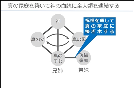 これは、真の父母様だけでは祝福を行うことはできず、真の父母様に真の子女様がいてこそ、祝福を行うことができる、ということである。つまり、祝福を通して真の家庭に接ぎ木されるのである。