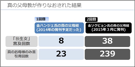 そして何より、『真の父母経』というものが出てきた。お母様はこれが三つの経典の中で最も重要なものだと語っておられる。この『真の父母経』は実は一度、作り直されている。最初の『真の父母経』は独生女言及が8回、お母様のみ言引用が23回であり、これも問題である。本来はお父様のみ言以外を一切、入れてはいけないと語られている。さらに二回目の『真の父母経』には独生女言及が23回、お母様のみ言引用が239回である。この二回目の『真の父母経』を編集した人は、金ソッピョン氏である。